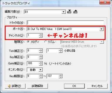 - 「ポート」に、MIDI Yoke を選択したポート(ポートB)を選択。